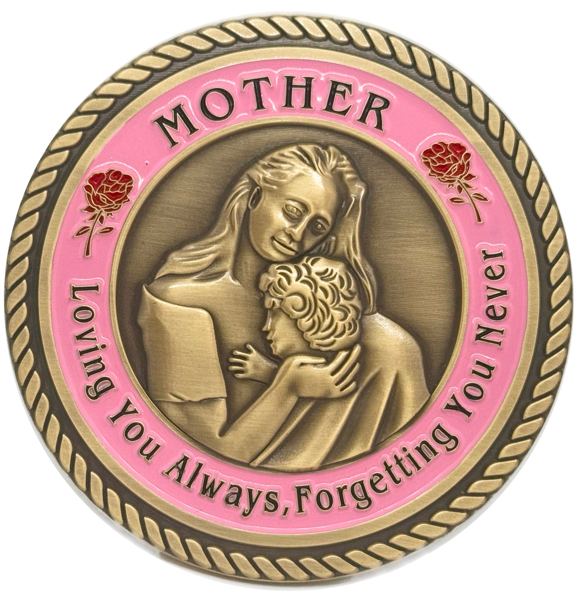 The high-relief centerpiece depicts a mother holding her child close, rendered with soft expression and flowing detail that draws the eye and the heart inward. Encircling the scene, a warm pink enamel ring bears the words: “Mother – Loving You Always, Forgetting You Never.” Delicate rose accents symbolize devotion, remembrance, and enduring grace.